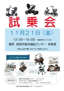 | 【福祉機器等体験・試乗会の開催】 電動カートや電動車いす、珍しい4輪車なども試乗できます。 手すりやリフト、また生活の中で使う自助具などもゆっくり見て触っていただけます。 当日は、リハビリセンターの職員や福祉機器の業者の方にも色々相談もできます。 ぜひ、日常の生活を豊かにする福祉機器の体験・試乗におこしください。