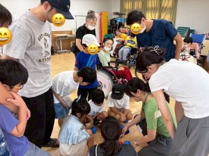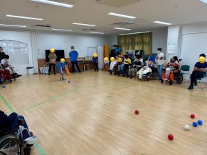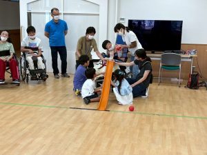 たくさんの子供たちが参加してくれ、ゲームとしても接戦の大盛り上がりの時間でした。自分でボールを投げるのが難しいご本人さんが使う補助具「ランプ」も参加した子供たちが率先して手伝ってくれました!